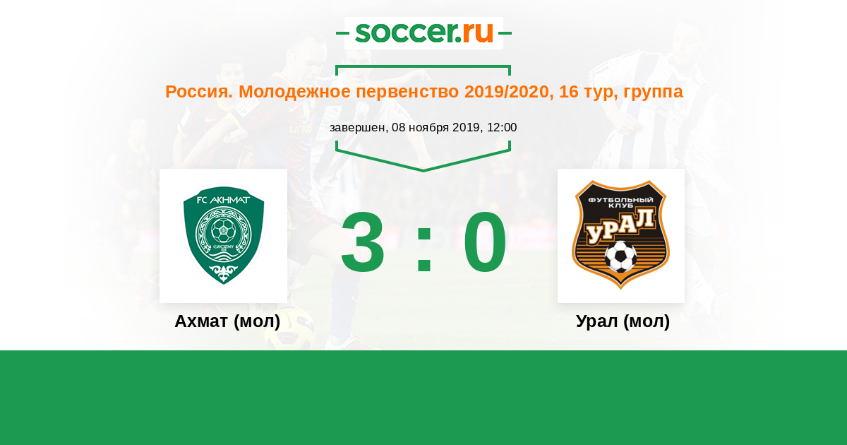 Россия. Премьер-Лига U21 10.03.2019 Ахмат (мол) Логотип футбольный клуб Ахмат (мол) (Грозный) 1:0 Логотип футбольный клуб Урал (мол) (Екатеринбург) Урал (мол)
