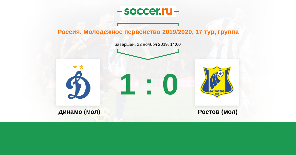 Россия. Премьер-Лига U21 09.11.2018 Ростов (мол) Логотип футбольный клуб Ростов (мол) (Ростов-на-Дону) 0:1 Логотип футбольный клуб Динамо (мол) (Москва) Динамо (мол)