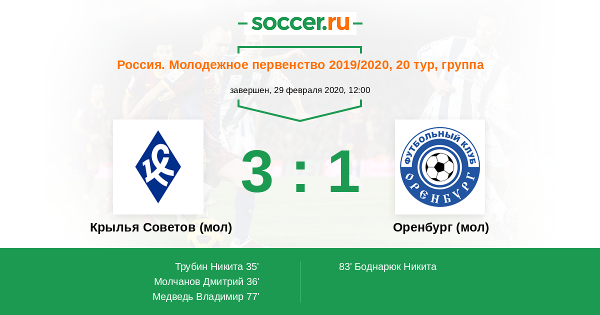 Протокол матча Крылья Советов (мол) против Оренбург (мол)