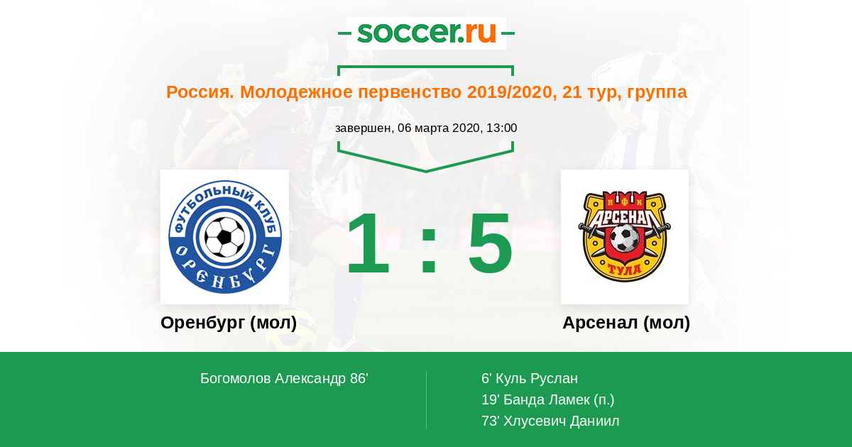 Протокол матча Оренбург (мол) против Арсенал (мол)