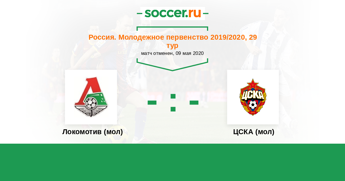 Россия. Премьер-Лига U21 19.04.2019 Локомотив (мол) Логотип футбольный клуб Локомотив (мол) (Москва) 2:0 Логотип футбольный клуб ЦСКА (мол) (Москва) ЦСКА (мол)