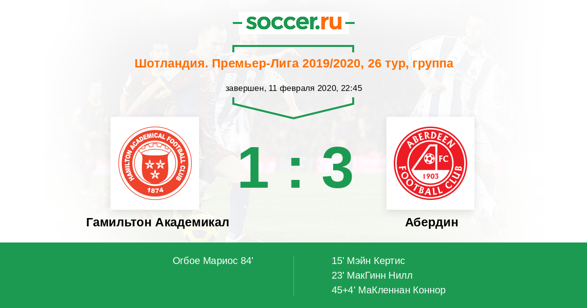 Протокол матча Гамильтон Академикал против Абердин
