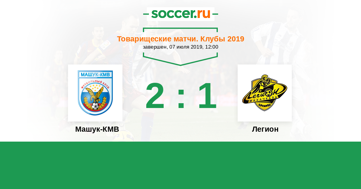Россия. Вторая лига. Группа 1 17.04.2019 Машук-КМВ Логотип футбольный клуб Машук-КМВ (Пятигорск) 1:0 Логотип футбольный клуб Легион (Махачкала) Легион