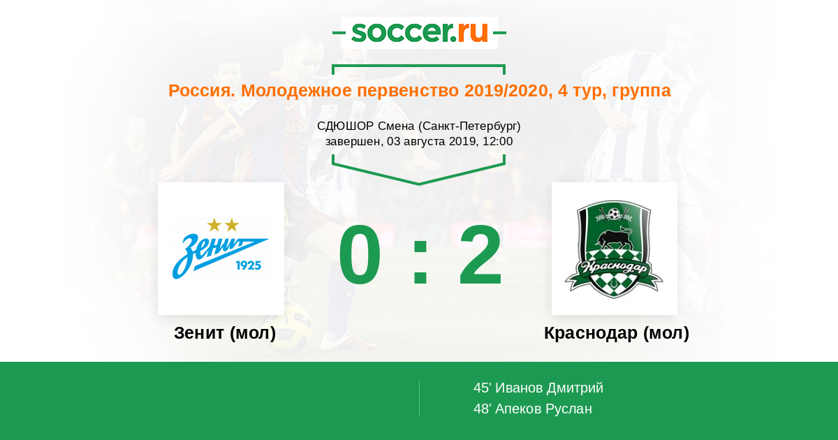 Протокол матча Зенит (мол) против Краснодар (мол)