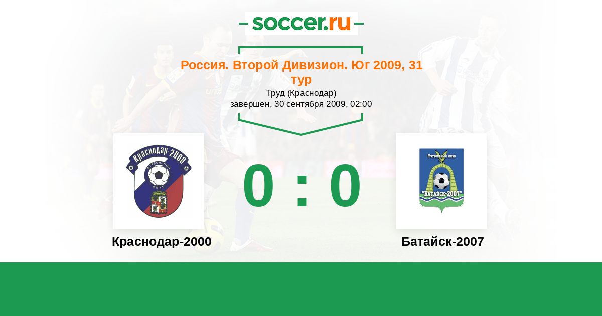 Россия. Вторая лига. Группа 1 13.06.2009 Батайск-2007 Логотип футбольный клуб Батайск-2007 2:0 Логотип футбольный клуб Краснодар-2000 Краснодар-2000