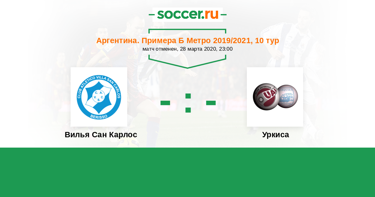 Аргентина. Примера Б Метро 19.03.2018 Уркиса Логотип футбольный клуб Уркиса (Вилья Линч) 1:1 Логотип футбольный клуб Вилья Сан Карлос (Берисо) Вилья Сан Карлос