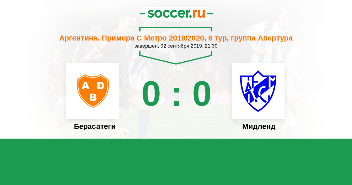 Аргентина. Примера С Метро 08.09.2018 Мидленд Логотип футбольный клуб Мидленд (Либертад) 0:2 Логотип футбольный клуб Берасатеги (Буэнос-Айрес) Берасатеги