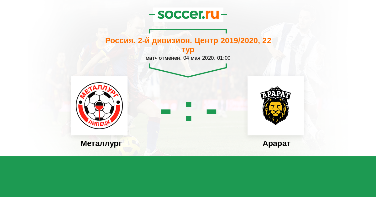 Россия. Вторая лига. Группа 3 14.04.2018 Арарат Логотип футбольный клуб Арарат (Москва) 3:0 Логотип футбольный клуб Металлург (Липецк) Металлург