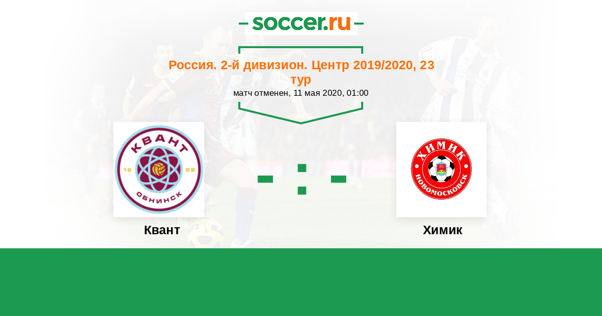 Россия. Вторая лига. Группа 3 26.05.2019 Квант Логотип футбольный клуб Квант (Обнинск) 3:0 Логотип футбольный клуб Химик (Новомосковск) Химик