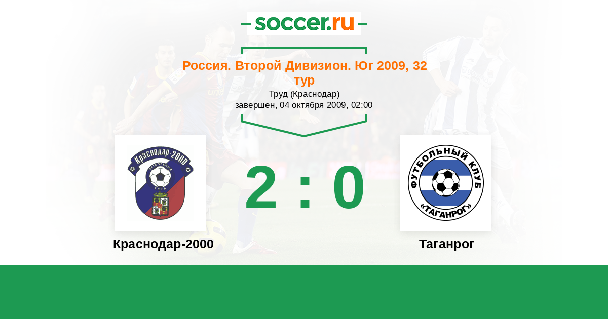 Россия. Вторая лига. Группа 1 25.08.2010 Краснодар-2000 Логотип футбольный клуб Краснодар-2000 1:1 Логотип футбольный клуб Таганрог Таганрог