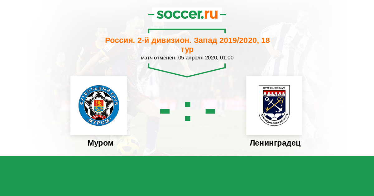 Россия. Вторая лига. Группа 2 29.08.2020 Ленинградец Логотип футбольный клуб Ленинградец (Ленинградская обл.) 0:2 Логотип футбольный клуб Муром Муром