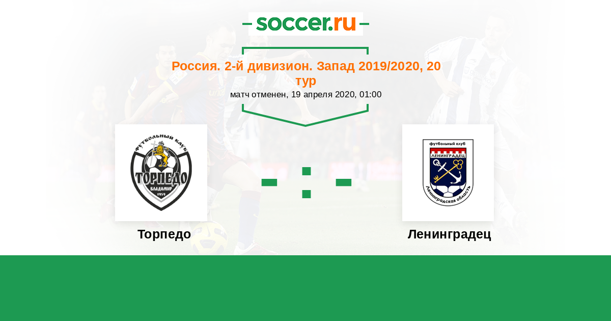 Россия. Вторая лига. Группа 2 15.08.2020 Торпедо Логотип футбольный клуб Торпедо (Владимир) 1:2 Логотип футбольный клуб Ленинградец (Ленинградская обл.) Ленинградец
