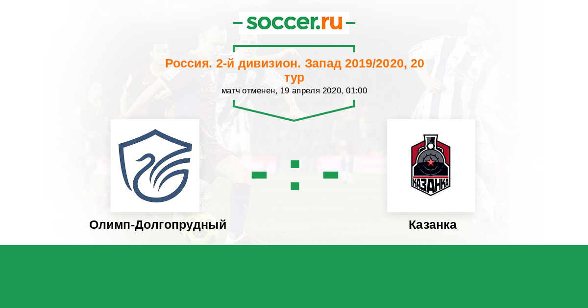 Россия. Вторая лига. Группа 2 12.04.2021 Олимп-Долгопрудный Логотип футбольный клуб Олимп-Долгопрудный 2:0 Логотип футбольный клуб Казанка (Москва) Казанка