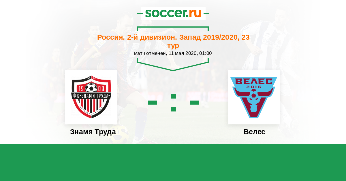 Россия. Вторая лига. Группа 2 26.07.2018 Велес Логотип футбольный клуб Велес (Москва) 1:1 Логотип футбольный клуб Знамя Труда (Орехово-Зуево) Знамя Труда