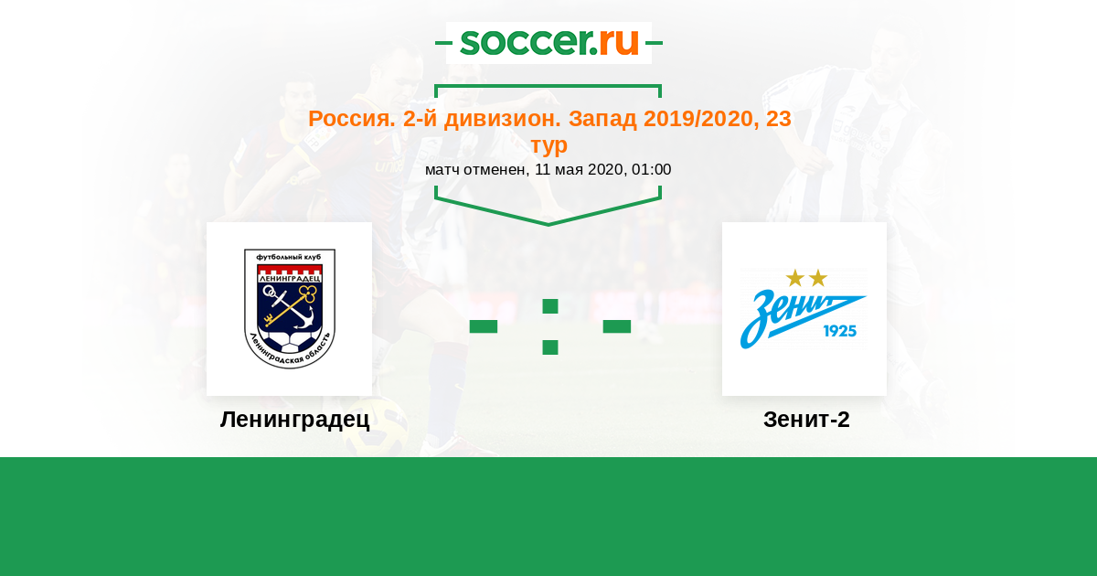 Россия. Вторая лига. Группа 2 04.06.2021 Зенит-2 Логотип футбольный клуб Зенит-2 (Санкт-Петербург) 2:2 Логотип футбольный клуб Ленинградец (Ленинградская обл.) Ленинградец