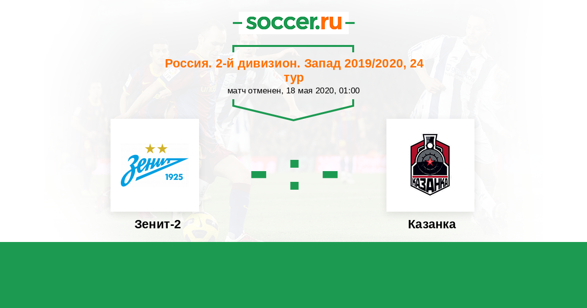 Россия. Вторая лига. Группа 2 06.09.2020 Зенит-2 Логотип футбольный клуб Зенит-2 (Санкт-Петербург) 6:0 Логотип футбольный клуб Казанка (Москва) Казанка