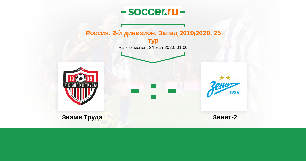 Россия. Вторая лига. Группа 2 01.04.2021 Знамя Труда Логотип футбольный клуб Знамя Труда (Орехово-Зуево) 3:1 Логотип футбольный клуб Зенит-2 (Санкт-Петербург) Зенит-2