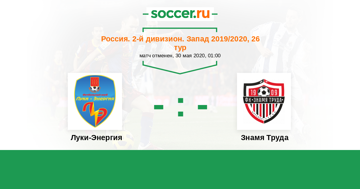 Россия. Вторая лига. Группа 2 03.05.2019 Луки-Энергия Логотип футбольный клуб Луки-Энергия (Великие Луки) 0:2 Логотип футбольный клуб Знамя Труда (Орехово-Зуево) Знамя Труда