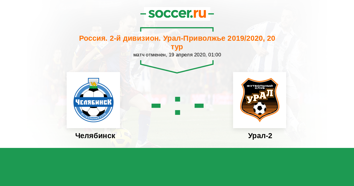 Россия. Вторая лига. Группа 4 05.05.2019 Урал-2 Логотип футбольный клуб Урал-2 (Екатеринбург) 1:1 Логотип футбольный клуб Челябинск Челябинск