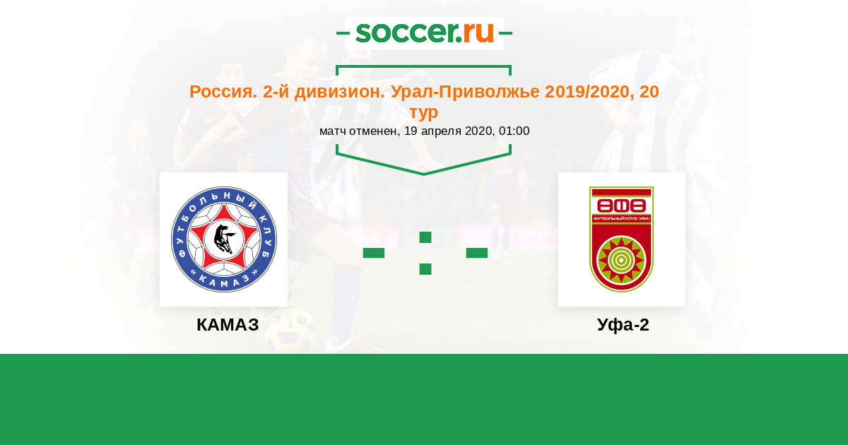 Россия. Вторая лига. Группа 4 21.04.2019 КАМАЗ Логотип футбольный клуб КАМАЗ (Набережные Челны) 2:0 Логотип футбольный клуб Уфа-2 Уфа-2
