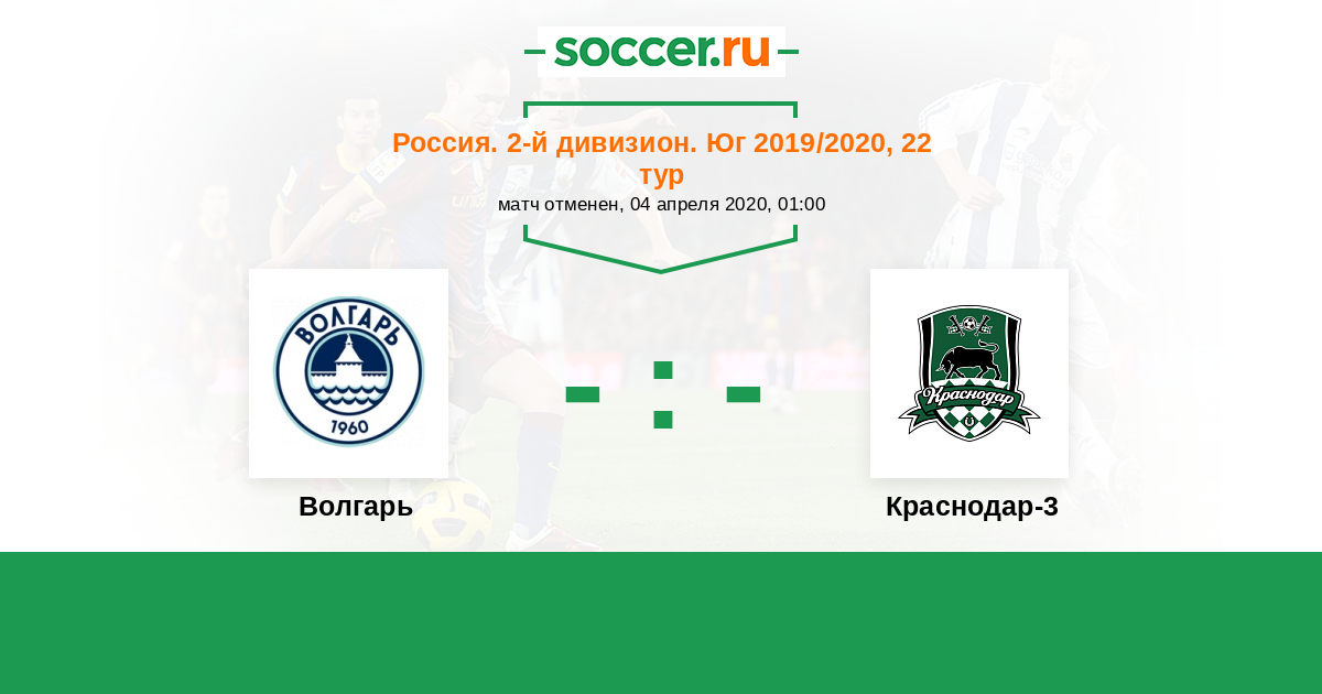 Россия. Вторая лига. Группа 1 27.03.2019 Краснодар-3 Логотип футбольный клуб Краснодар-3 1:1 Логотип футбольный клуб Волгарь (Астрахань) Волгарь