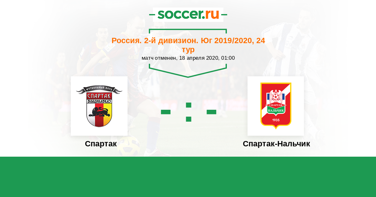 Россия. Вторая лига. Группа 1 25.07.2018 Спартак Логотип футбольный клуб Спартак (Владикавказ) 1:2 Логотип футбольный клуб Спартак-Нальчик Спартак-Нальчик