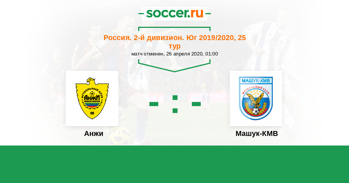 Россия. Вторая лига. Группа 1 28.09.2019 Машук-КМВ Логотип футбольный клуб Машук-КМВ (Пятигорск) 4:0 Логотип футбольный клуб Анжи (Махачкала) Анжи