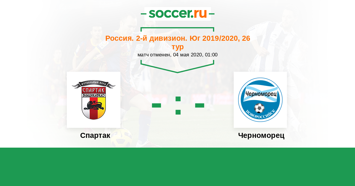 Россия. Вторая лига. Группа 1 05.10.2019 Черноморец Логотип футбольный клуб Черноморец (Новороссийск) 3:0 Логотип футбольный клуб Спартак (Владикавказ) Спартак