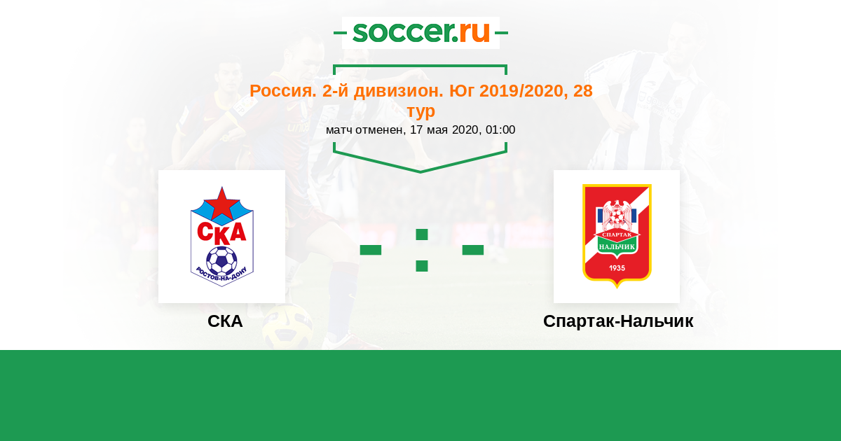 Россия. Вторая лига. Группа 1 18.04.2016 Спартак-Нальчик Логотип футбольный клуб Спартак-Нальчик 0:0 Логотип футбольный клуб СКА (Ростов-на-Дону) СКА