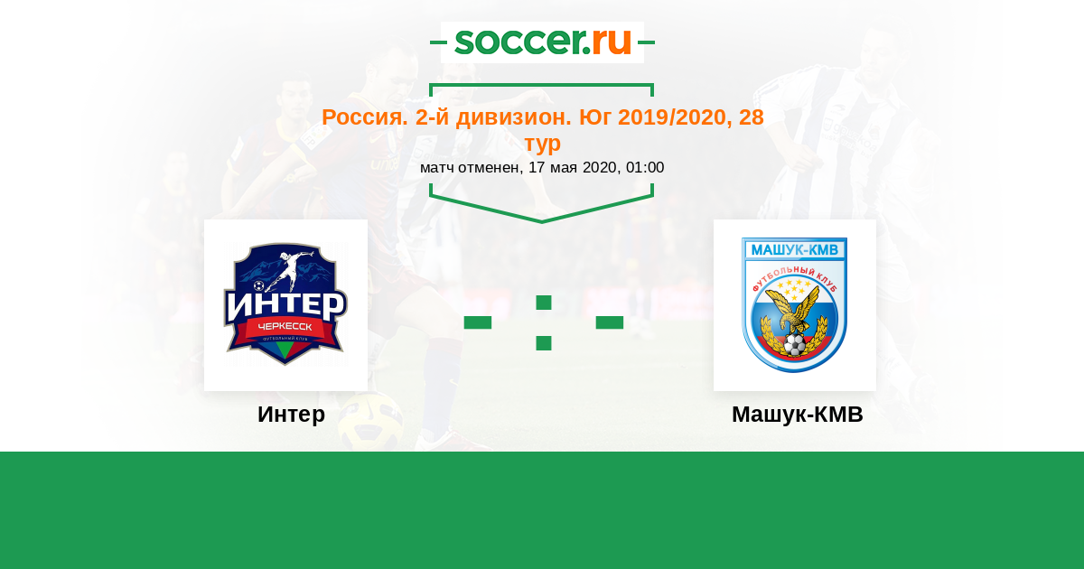 Россия. Вторая лига. Группа 1 23.08.2020 Машук-КМВ Логотип футбольный клуб Машук-КМВ (Пятигорск) 3:1 Логотип футбольный клуб Интер (Черкесск) Интер