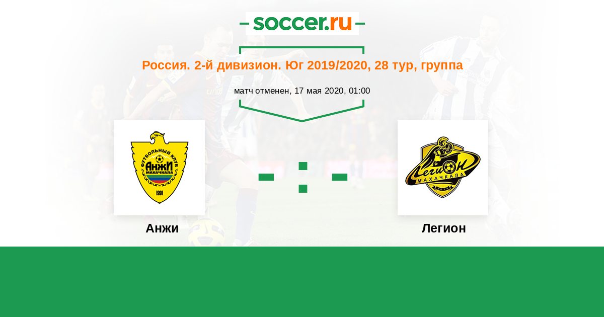 Россия. Вторая лига. Группа 1 23.08.2020 Легион Логотип футбольный клуб Легион (Махачкала) 4:1 Логотип футбольный клуб Анжи (Махачкала) Анжи