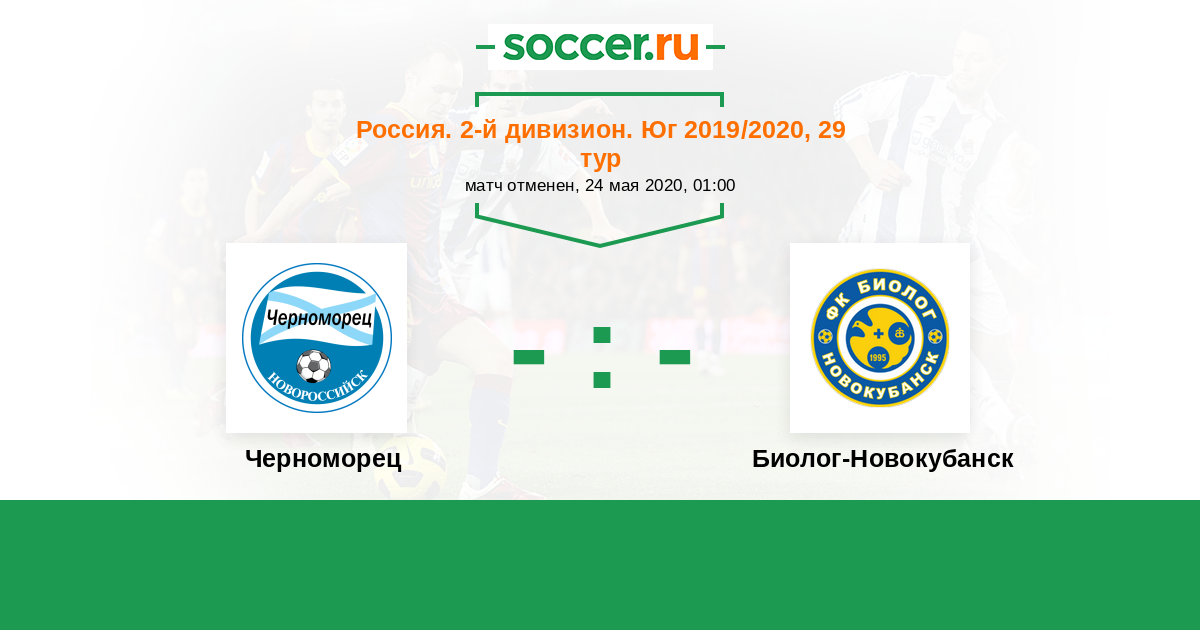Россия. Вторая лига. Группа 1 04.05.2019 Черноморец Логотип футбольный клуб Черноморец (Новороссийск) 2:0 Логотип футбольный клуб Биолог-Новокубанск Биолог-Новокубанск