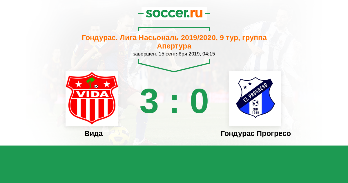 Гондурас. Лига Насьональ 20.09.2015 Вида Логотип футбольный клуб Вида (Ла-Сейба) 2:1 Логотип футбольный клуб Гондурас Прогресо (Эль-Прогресо) Гондурас Прогресо