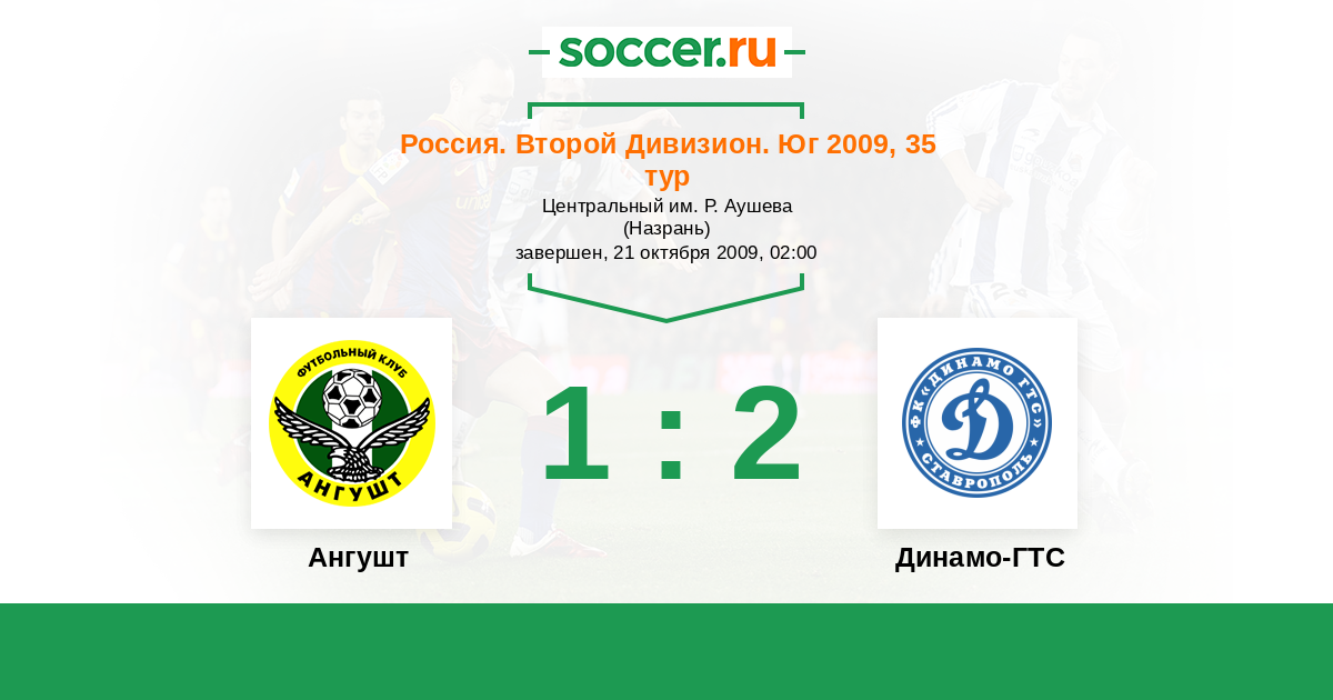 Россия. Вторая лига. Группа 1 05.07.2009 Кавказтрансгаз-2005 Логотип футбольный клуб Кавказтрансгаз-2005 (Ставрополь) 2:1 Логотип футбольный клуб Ангушт (Назрань) Ангушт
