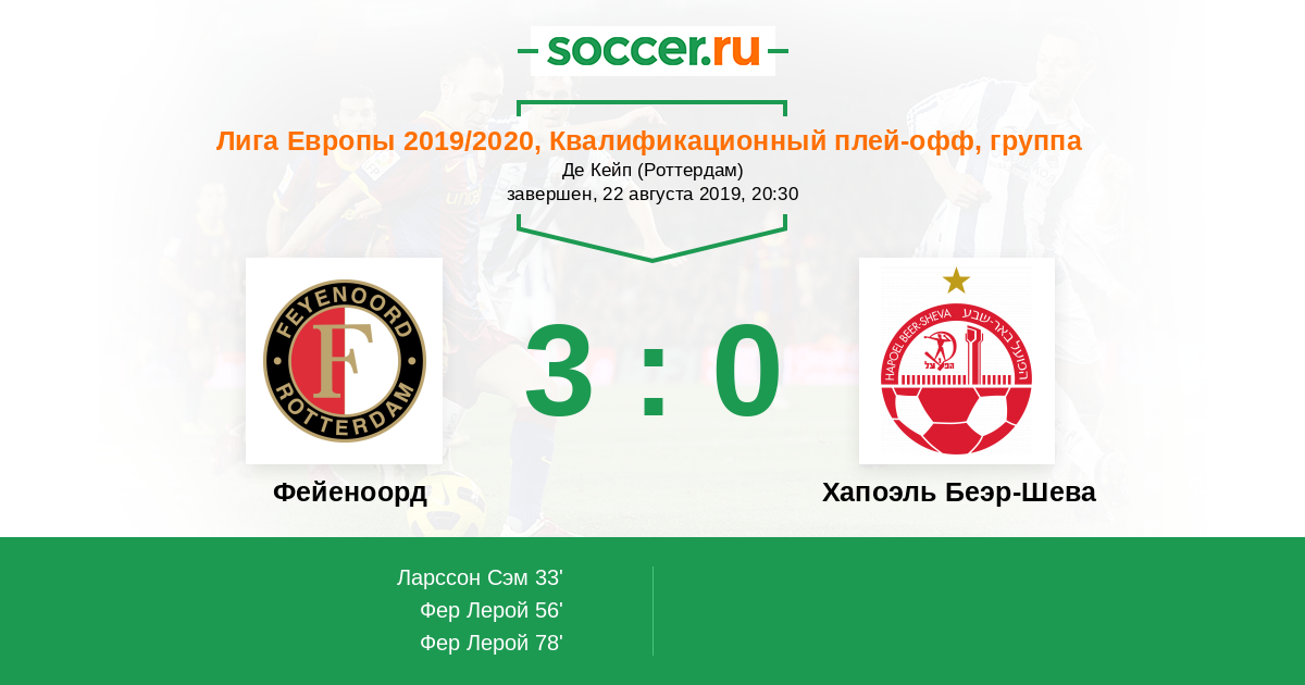 Протокол матча Фейеноорд против Хапоэль Беэр-Шева