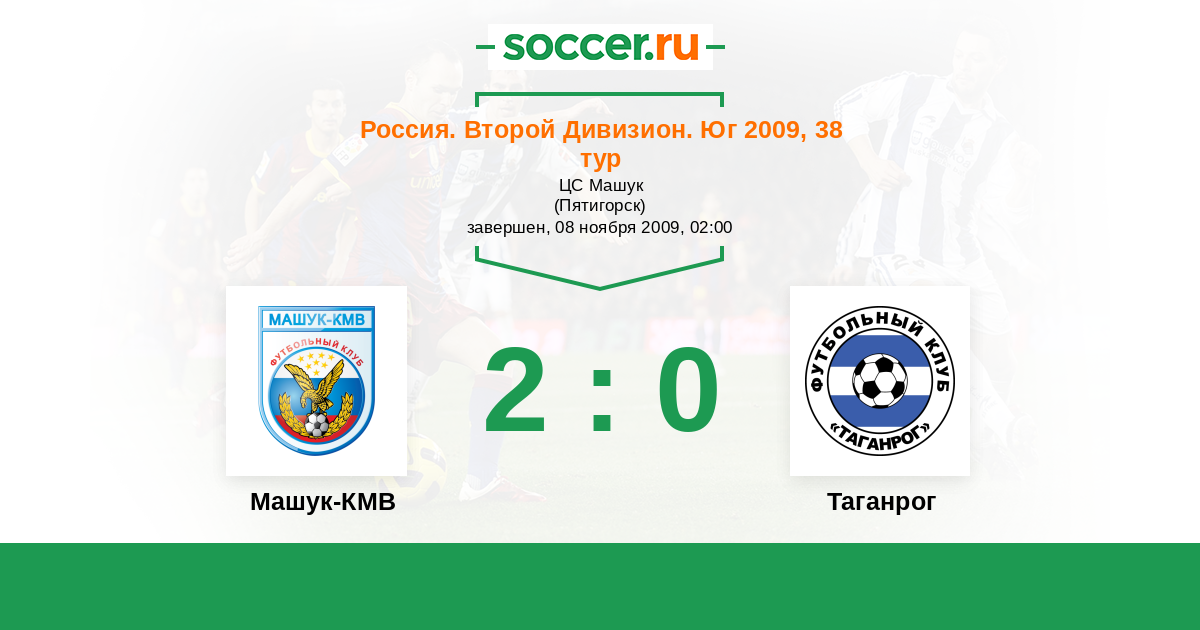 Россия. Вторая лига. Группа 1 05.04.2009 Таганрог Логотип футбольный клуб Таганрог 0:2 Логотип футбольный клуб Машук-КМВ (Пятигорск) Машук-КМВ