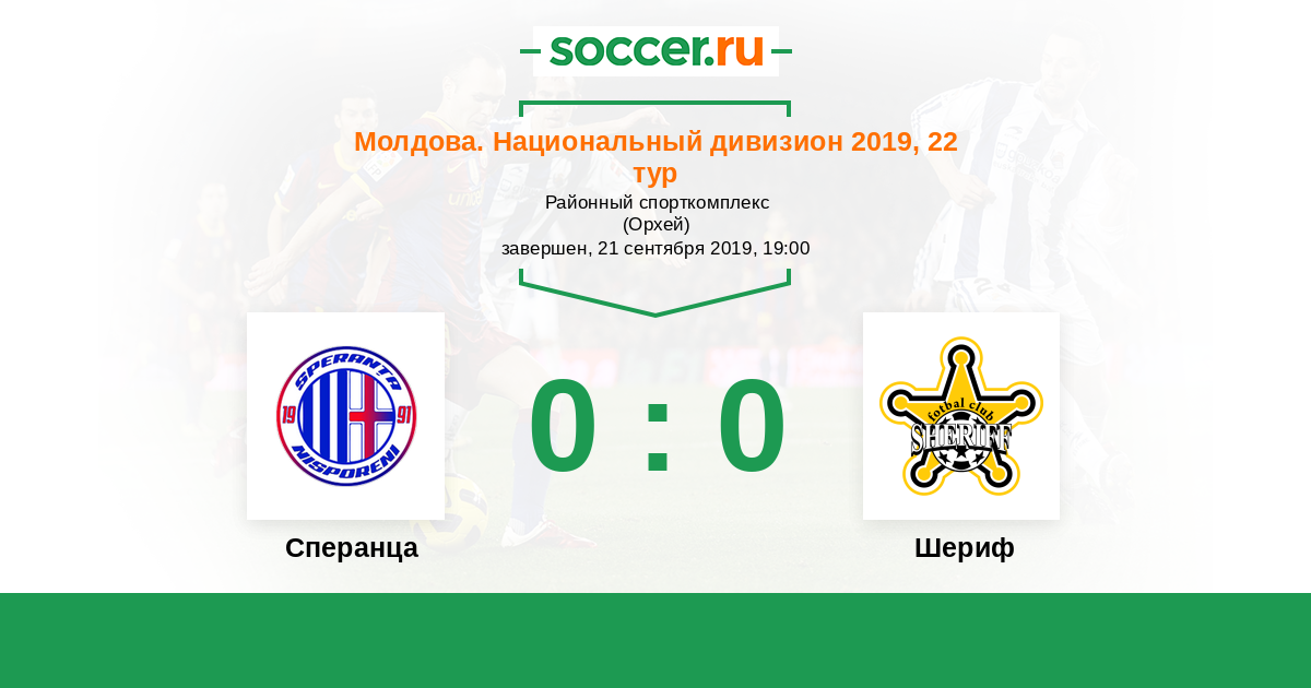 Молдова. Национальный дивизион 29.06.2019 Шериф Логотип футбольный клуб Шериф (Тирасполь) 3:0 Логотип футбольный клуб Сперанца (Крихана Веке) Сперанца
