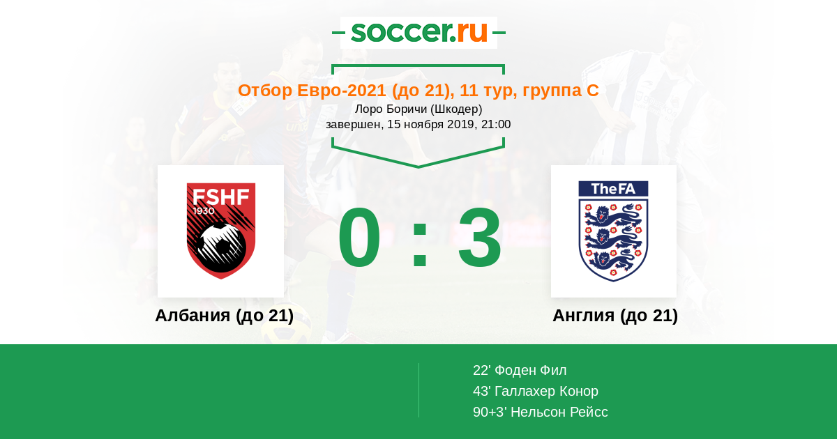 Протокол матча Албания (до 21) против Англия (до 21)