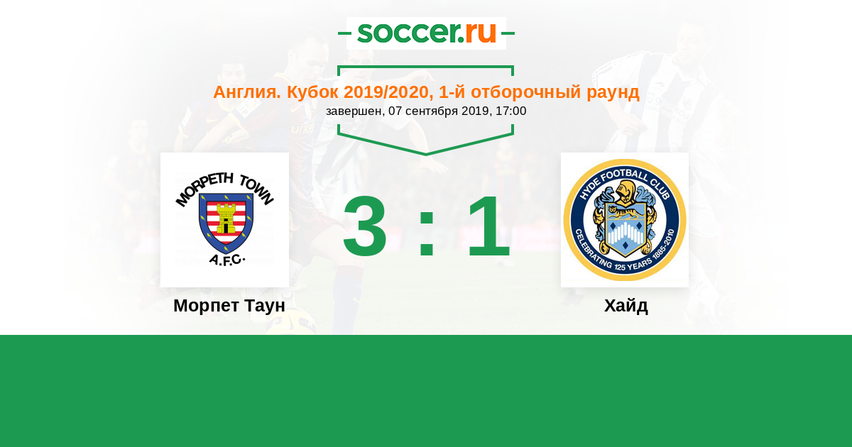 Англия. Истмийский дивизион 19.10.2019 Хайд Логотип футбольный клуб Хайд 1:1 Логотип футбольный клуб Морпет Таун Морпет Таун