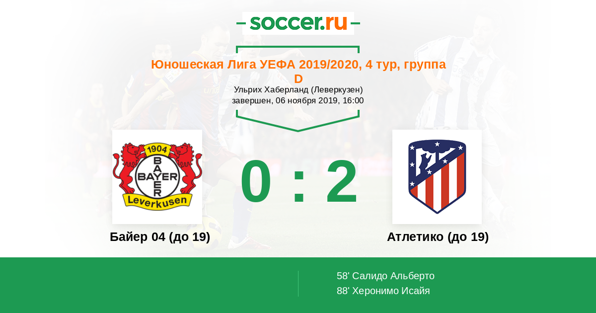 Протокол матча Байер 04 (до 19) против Атлетико (до 19)