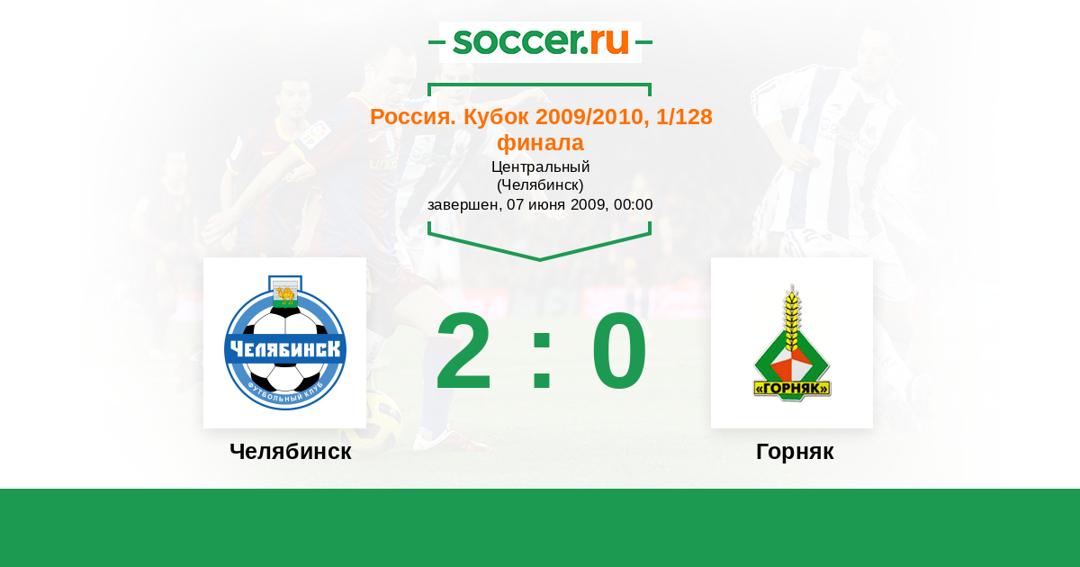Россия. Кубок 15.05.2010 Горняк Логотип футбольный клуб Горняк (Учалы) 2:0 Логотип футбольный клуб Челябинск Челябинск