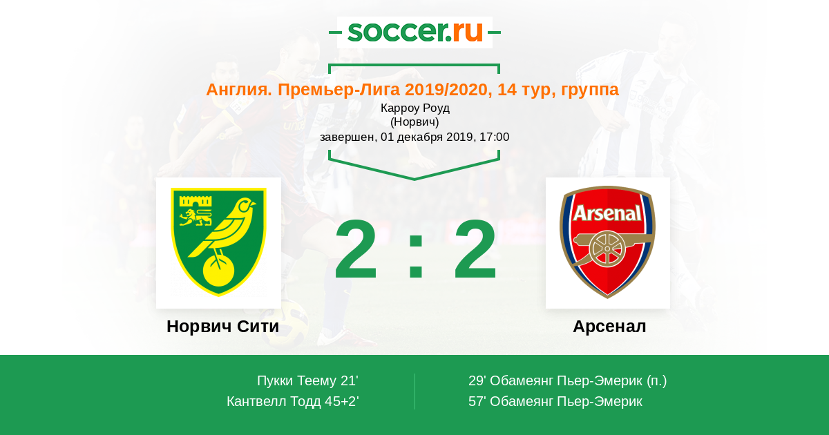 Протокол матча Норвич Сити против Арсенал