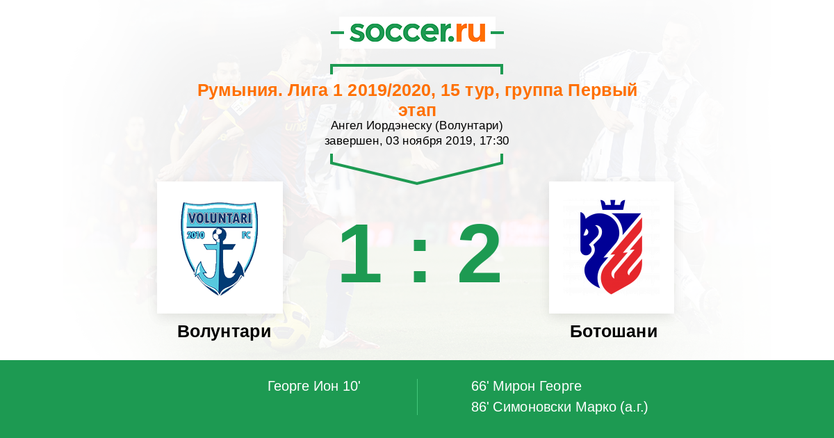 10' (1:0) Георге Ион (8) (Костин Кристиан (98))