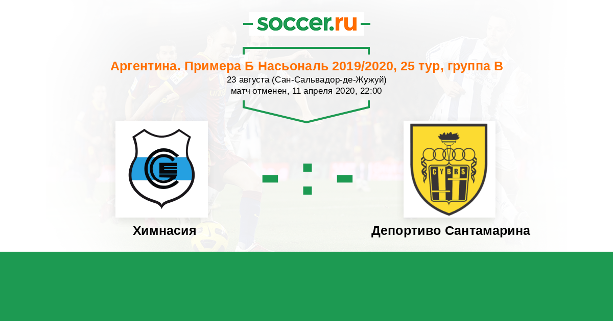 Аргентина. Примера Б Насьональ 22.10.2019 Депортиво Сантамарина Логотип футбольный клуб Депортиво Сантамарина (Тандил) 0:0 Логотип футбольный клуб Химнасия (Жужуй) Химнасия