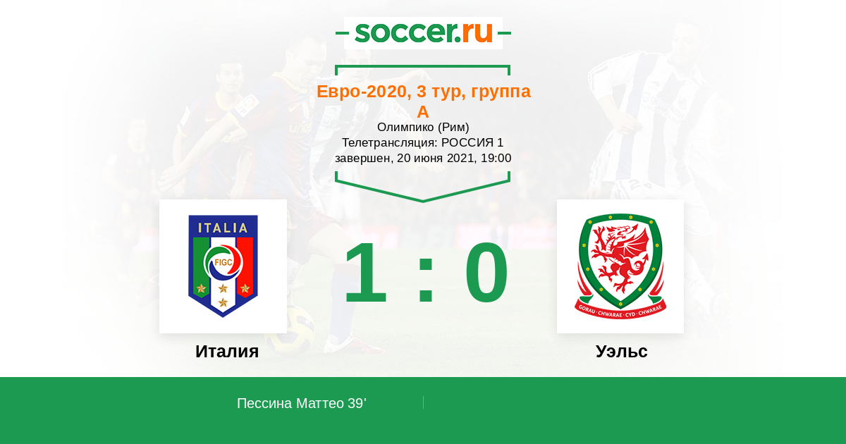 Уэльс: Уорд, Робертс, Мифэм, Родон, Дэвис, Моррелл, Аллен, Бэйл, Рэмзи, Джеймс, Мур. Прогноз: Италия - Уэльс 2:1