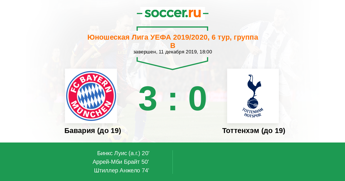Протокол матча Бавария (до 19) против Тоттенхэм (до 19)