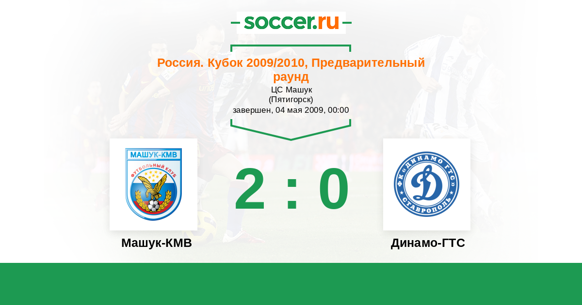 Россия. Вторая лига. Группа 1 10.04.2010 Кавказтрансгаз-2005 Логотип футбольный клуб Кавказтрансгаз-2005 (Ставрополь) 0:3 Логотип футбольный клуб Машук-КМВ (Пятигорск) Машук-КМВ