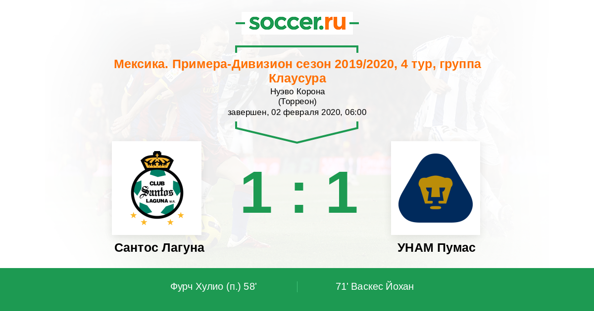 Протокол матча Сантос Лагуна против УНАМ Пумас