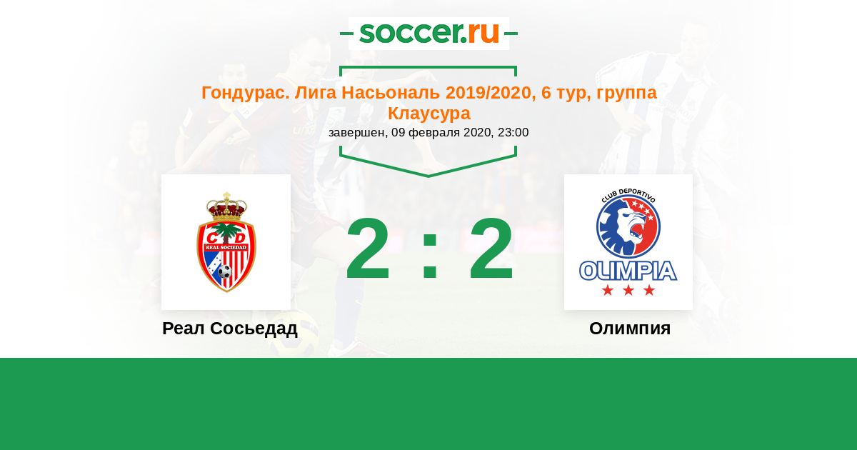 Гондурас. Лига Насьональ 05.08.2019 Олимпия Логотип футбольный клуб Олимпия (Тегусигальпа) 2:0 Логотип футбольный клуб Реал Сосьедад (Токоа) Реал Сосьедад