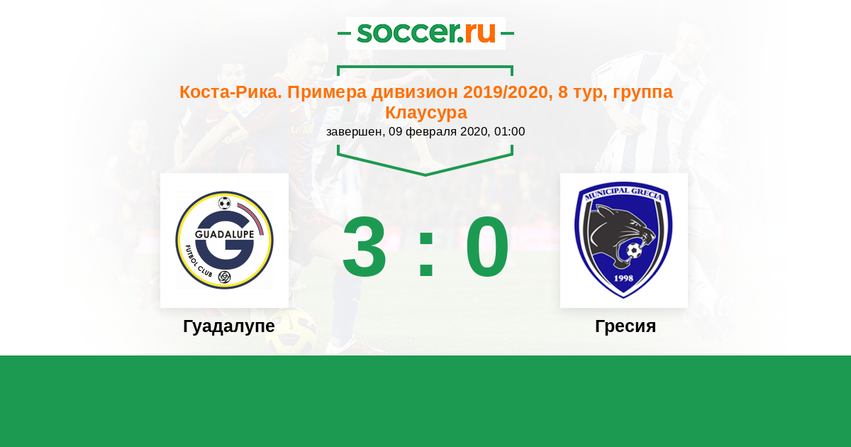Коста-Рика. Примера дивизион 01.09.2019 Гресия Логотип футбольный клуб Гресия 2:1 Логотип футбольный клуб Гуадалупе Гуадалупе
